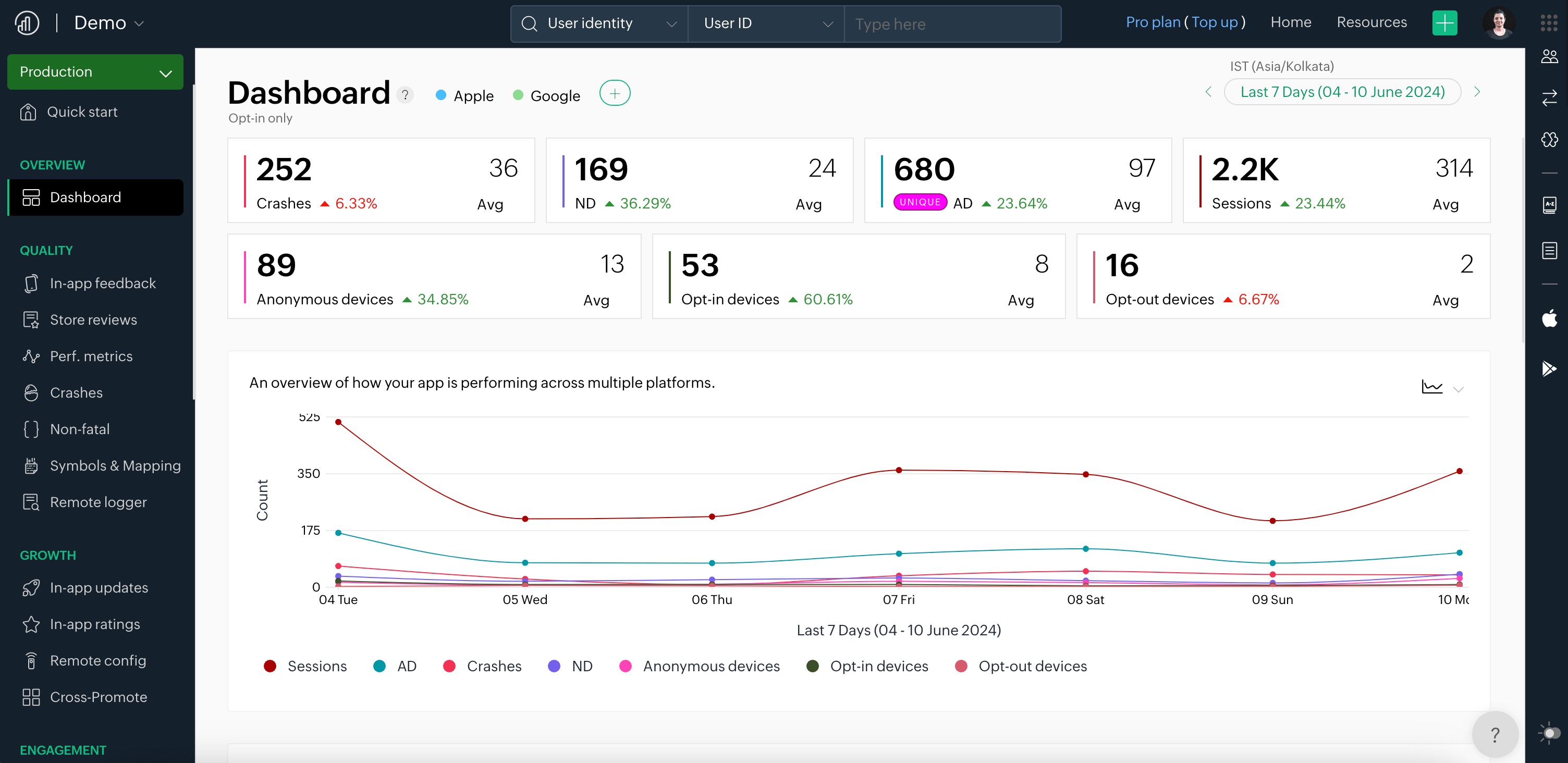 Developer-centric features like instant crash and bug reporting, in-app feedback, remote logging, custom properties, usage analytics, API latency, and remote configuration help your development team fix issues promptly and deliver seamless experiences to users. Whereas, features like store reviews, feedback, engagement analytics, funnels, user flows, retention, and the like help your marketing and support teams understand and enhance the app journey for better user satisfaction.
