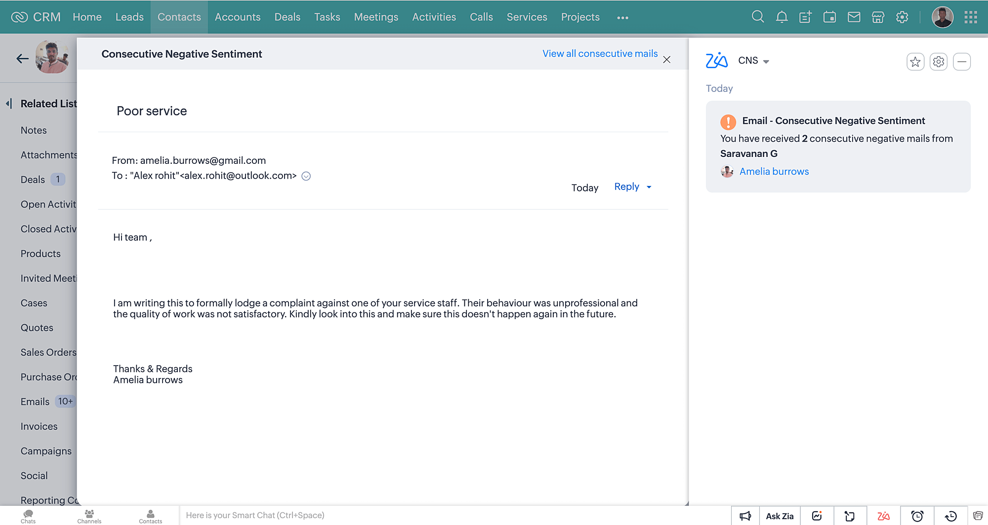 Zia's email sentiment analyzes the content of every incoming email from customers and tags them according to the type of sentiment the content conveys: positive, negative, or neutral. Now you can configure Zia to notify you anytime customers send multiple emails in a row that express a negative sentiment. This helps you stay informed, identify the cause of the customer's issues, and take corrective actions before your relationship deteriorates.