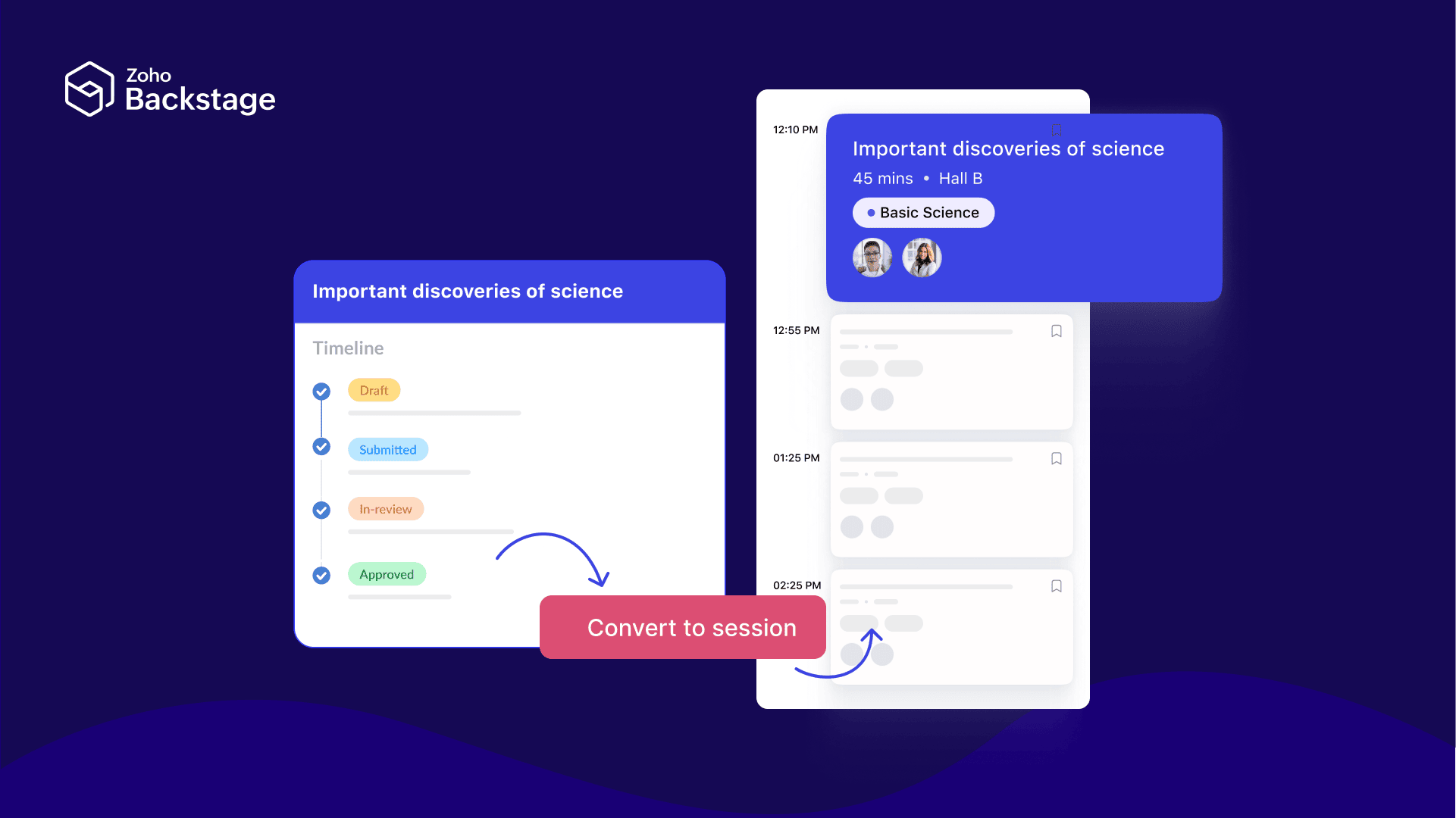With customizable forms, blind reviews, and the ability to convert approved abstracts into sessions, Zoho Backstage’s Abstract Management feature is designed to simplify your workflow and save you time. Whether you're managing a handful of abstracts or hundreds, Zoho Backstage helps you stay organized from start to finish.