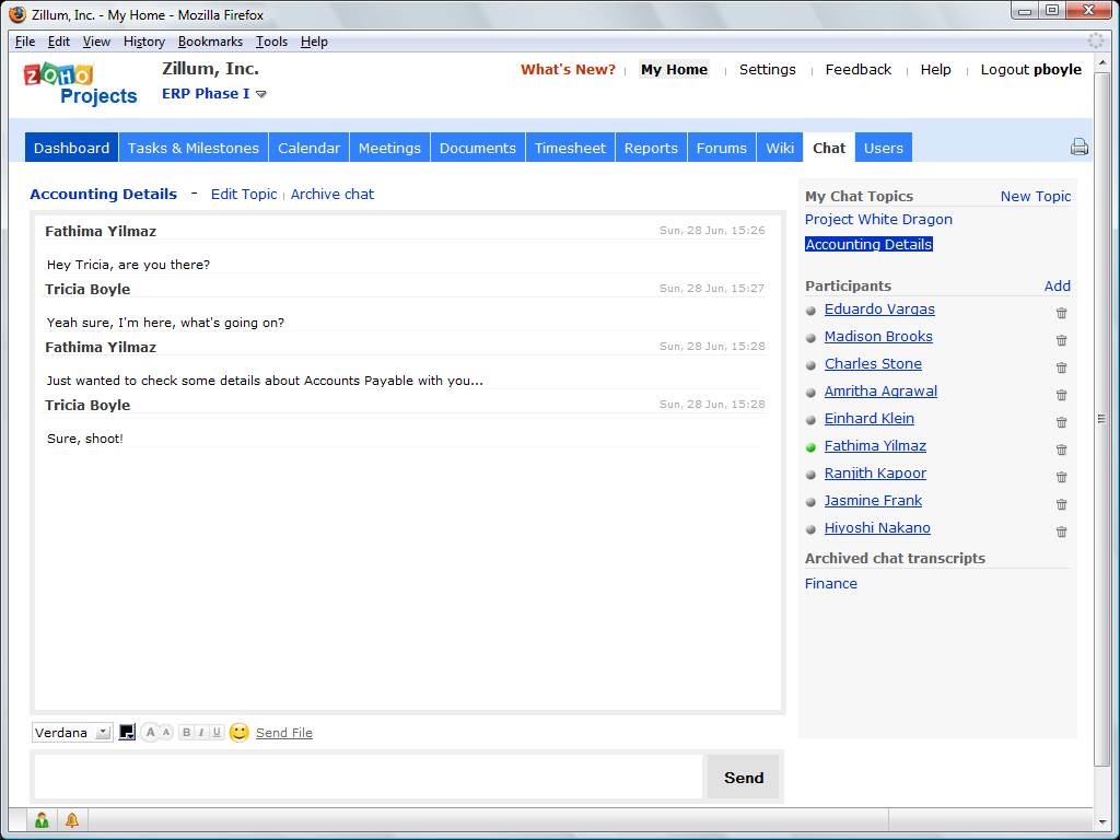 1. Embedded (and included in the price) group chat room helps your team make decisions faster. While Agile emphasizes face-to-face interactions, sometimes that's not possible. In the case of Zoho, we have a distributed company, with most of the product and marketing activities happening between US, India and Japan. Even when your projects team is local, your customer might not. Zoho Projects also allows you to set both "internal" and "external" (i.e. customer) users, so you can set different levels of access for each.
