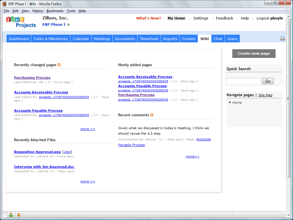 3. Older software development methodologies argued for "requirements" to be set in stone and pretty much frozen before the first line of code was written. In contrast, Agile calls for flexibility around deadlines and when requirements come int. Zoho Project's included project Wiki is an ideal place where the entire team can keep track of the changing requirements. And of course, not only that, you can also go back and track how the requirements have changed over time using version control.