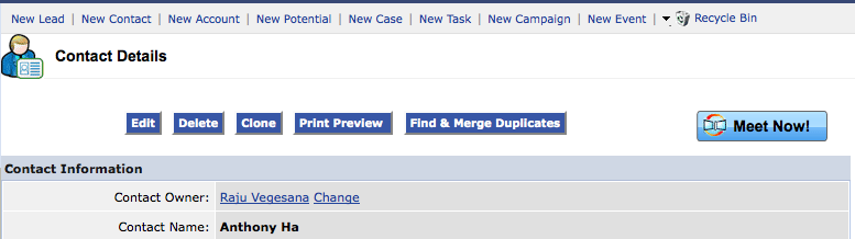 When I view a contact in CRM, a 'Meet Now' button contextually appears for that contact. Choosing 'Meet Now' starts a meeting