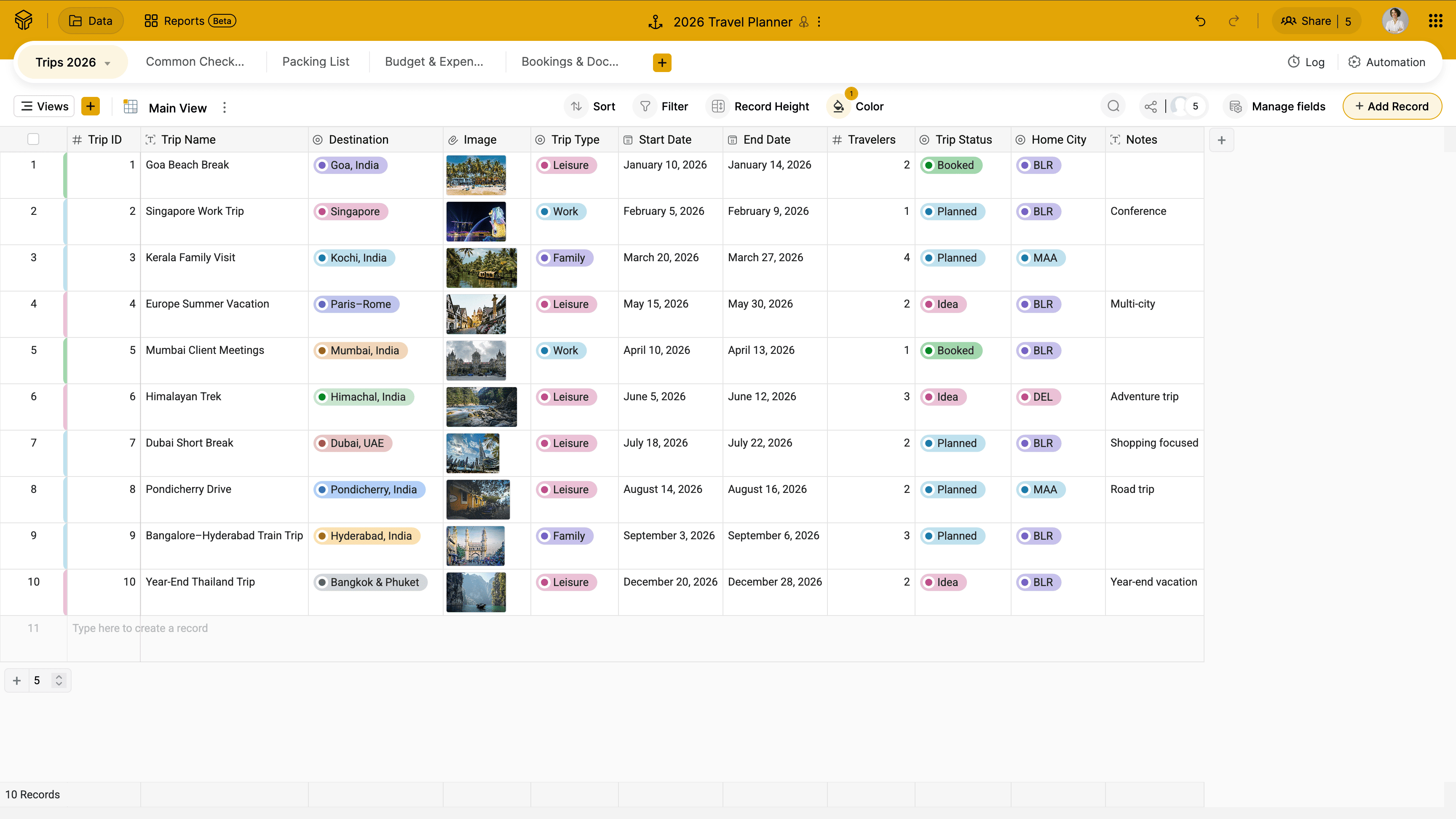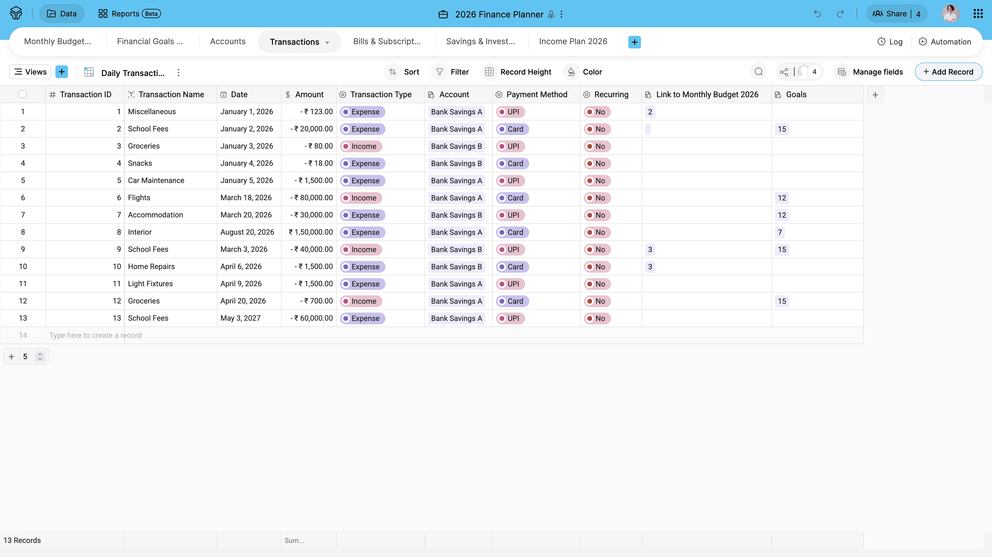 The free Finance Planner helps you set financial goals and stay in control from day one. Use the Financial goals grid view to plan income, budgets, and savings in one place. Link your Accounts table to Transactions and Bills & Subscriptions. Log all your Savings & Investments in one table for better planning and easy tracking.