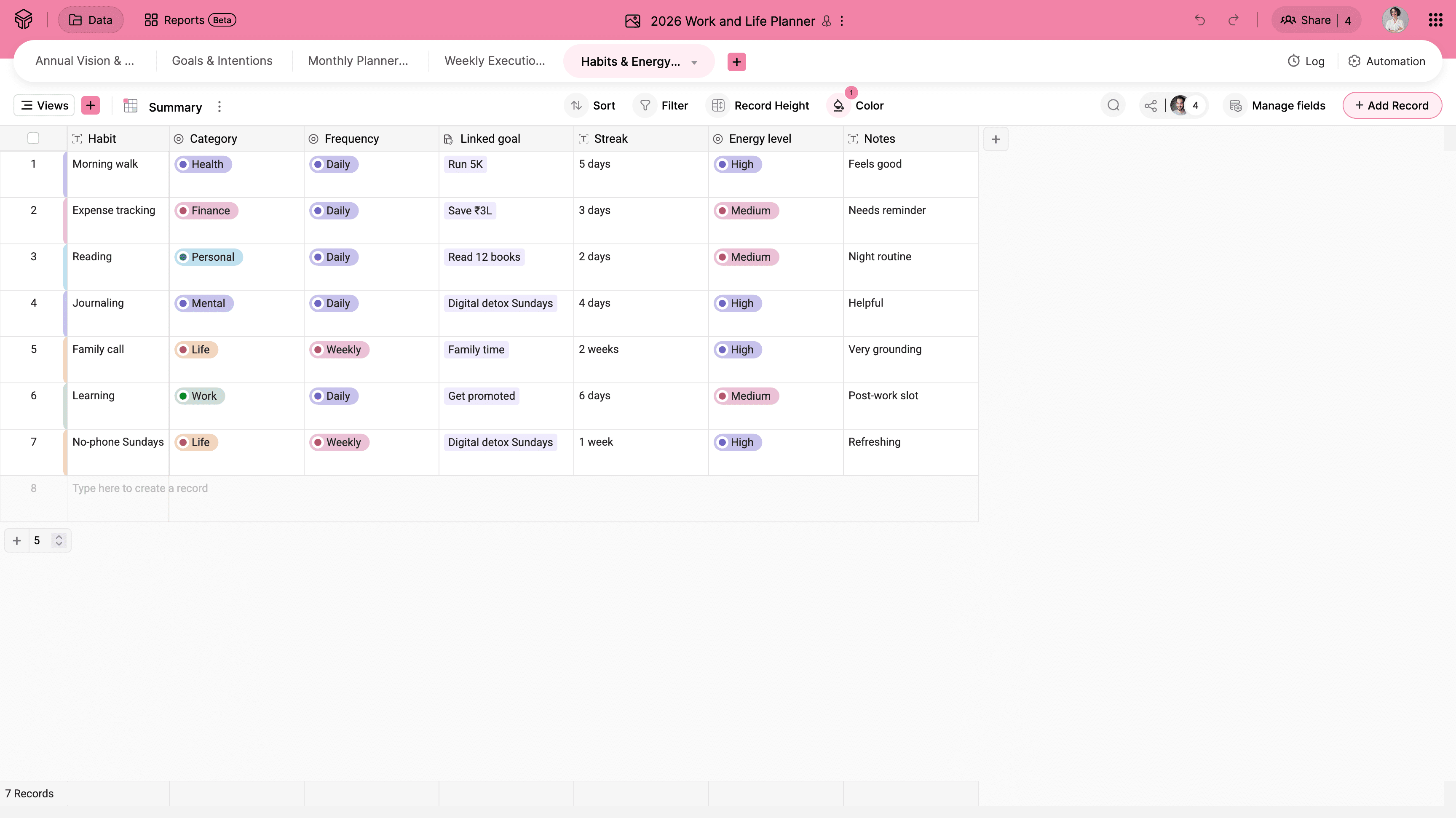 Use different views like Kanban View to track progress and switch between tables to move from big-picture goals to day-to-day actions and actually see momentum build.