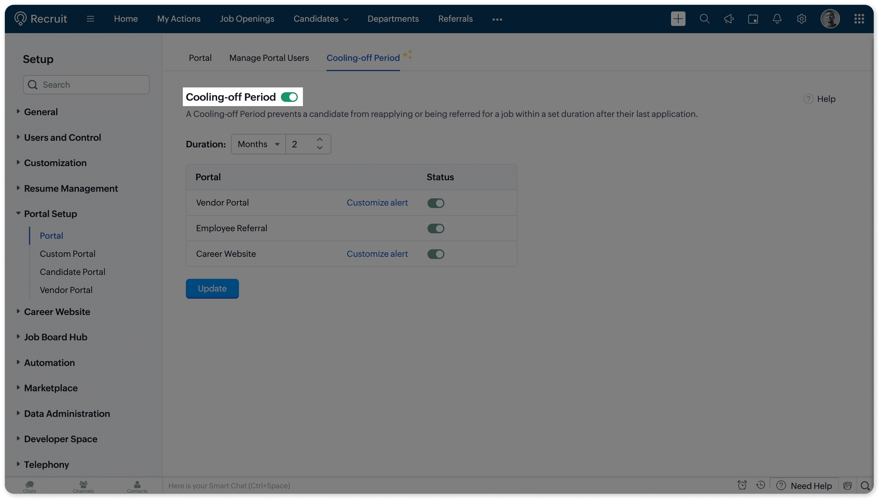 Cooling-off period change that. Set how long a candidate must wait before they can reapply or be referred again, whether through vendors, employee referrals, or your career site.