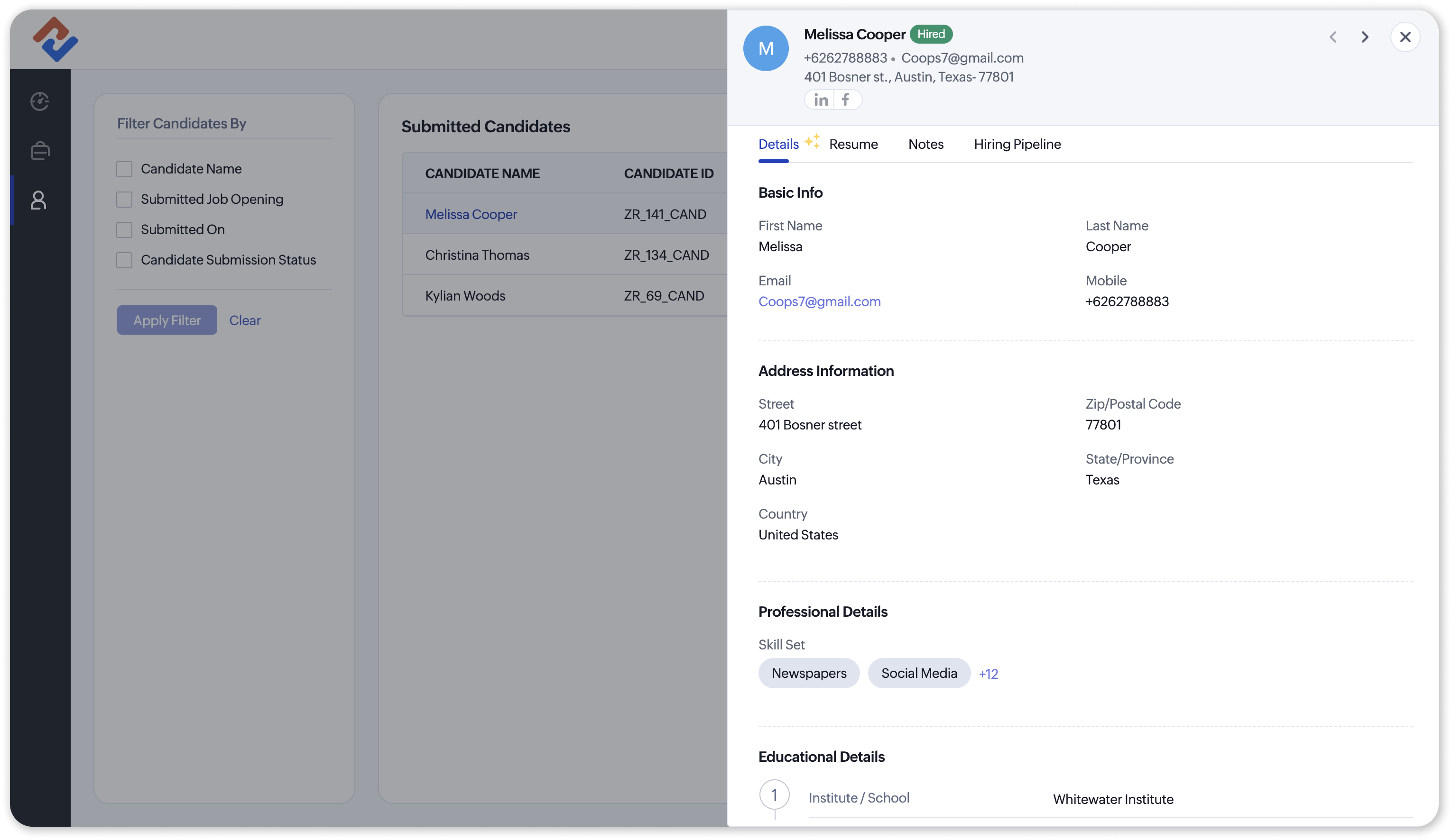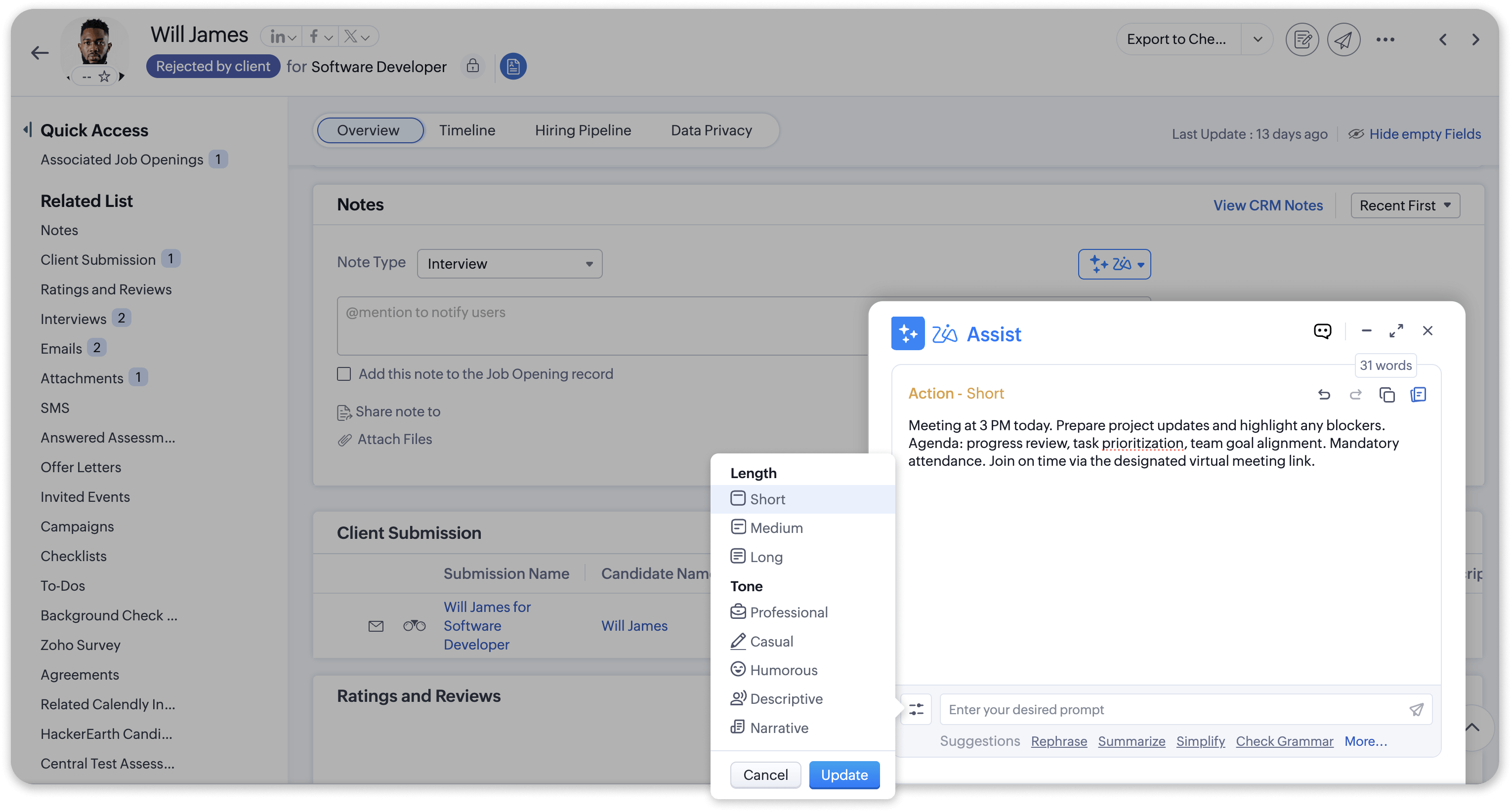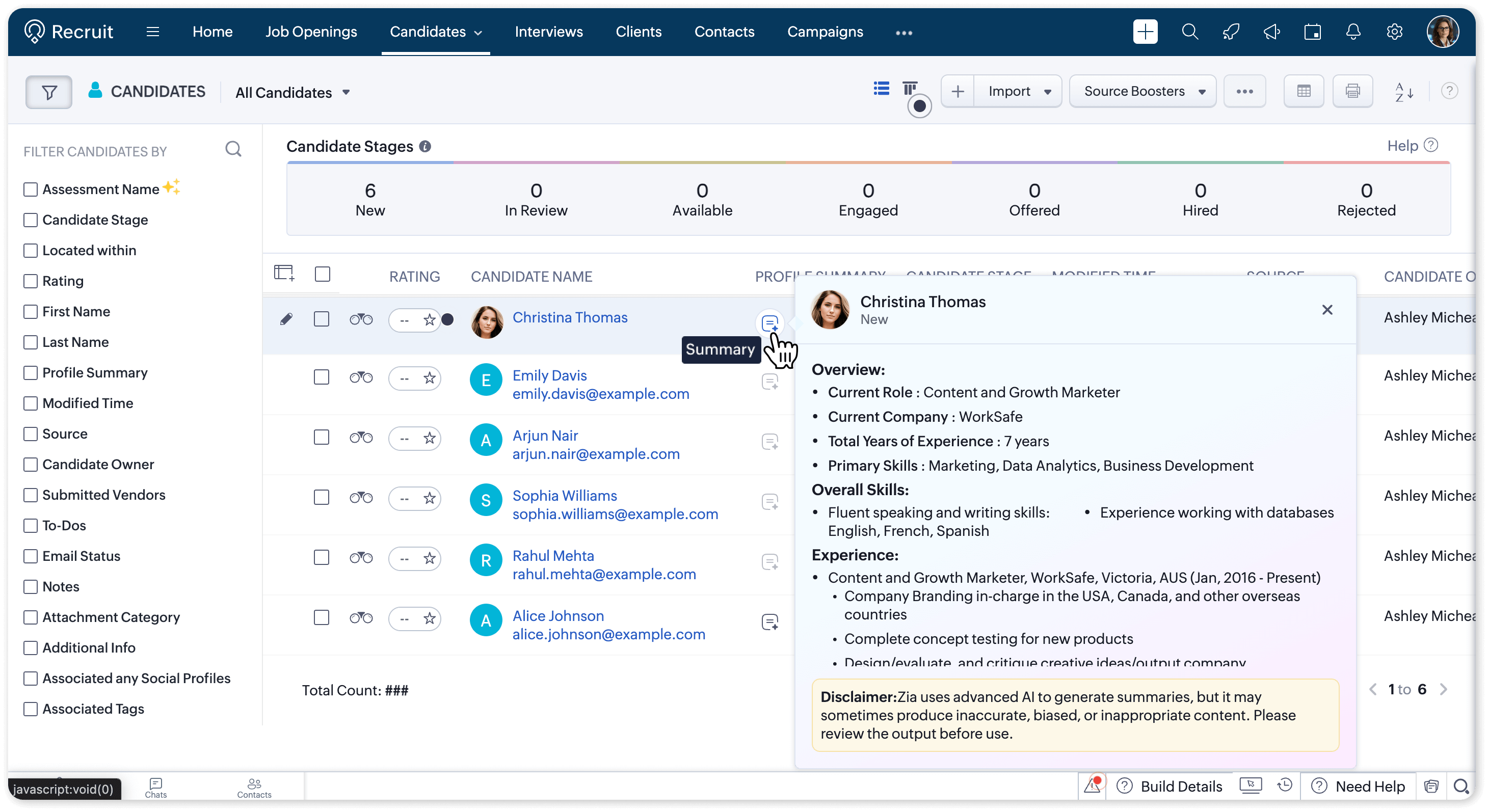 It's a super busy day. You open a resume among a hundred others. It’s five pages long, cluttered, and the formatting is messy. With the Profile Summary feature, powered by Zia, you can capture subtle insights and important details to present them in a clear, structured, and widely recognized format.