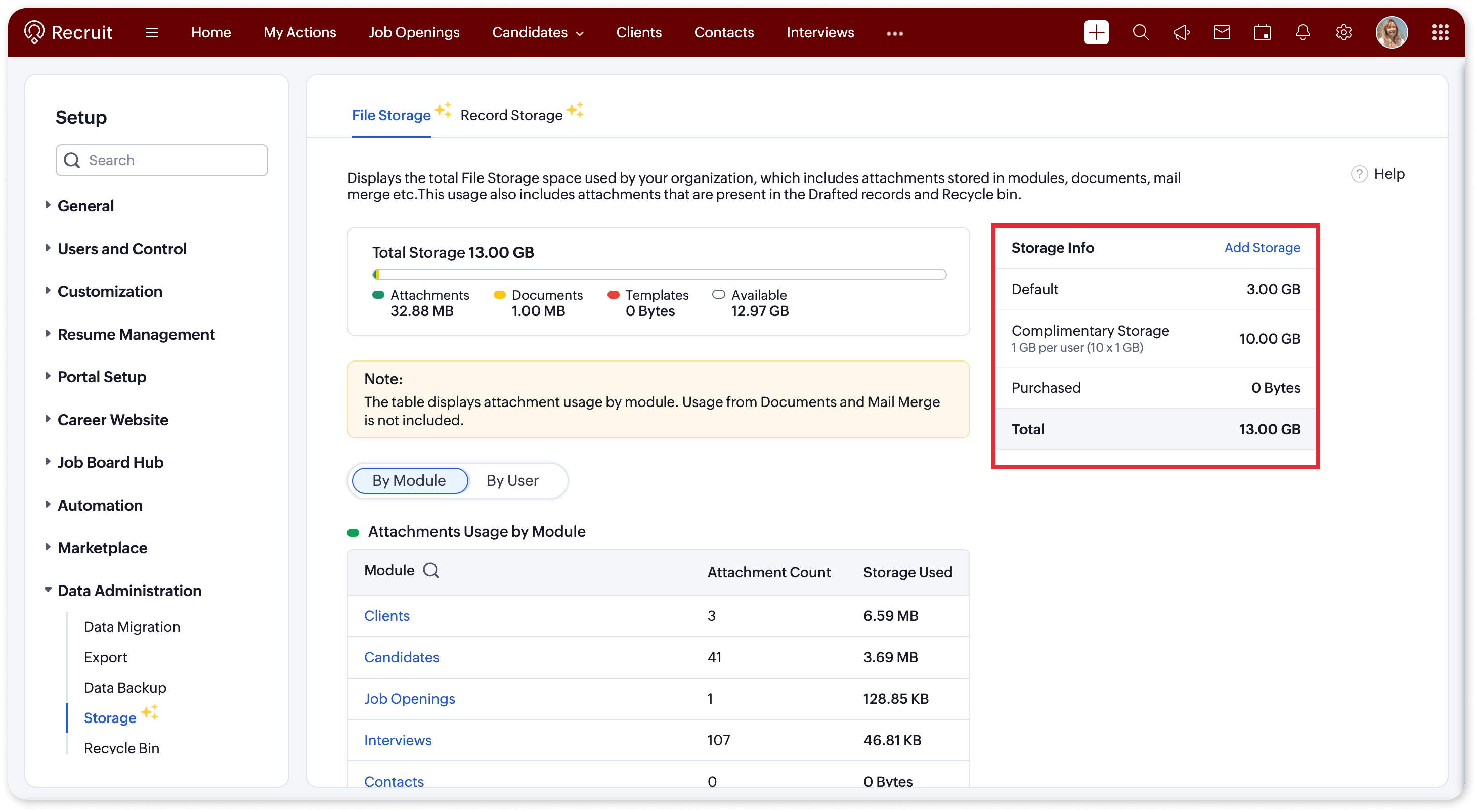 We have reset how you manage storage with record storage for better visibility and control in Zoho Recruit. See your total usage at a glance, track breakdowns by module or user, and expand capacity before it becomes a problem. Say goodbye to guessing where your storage went.