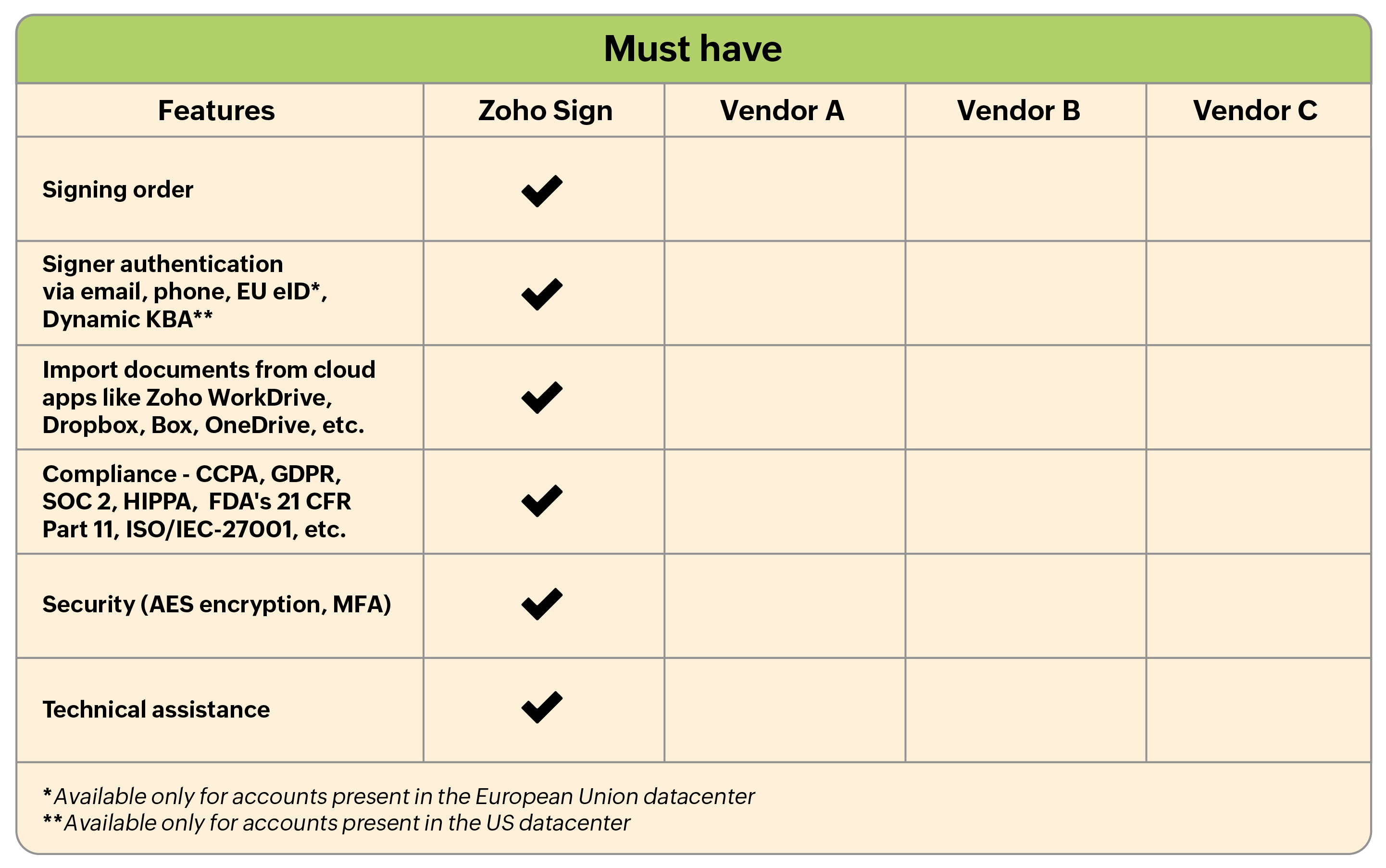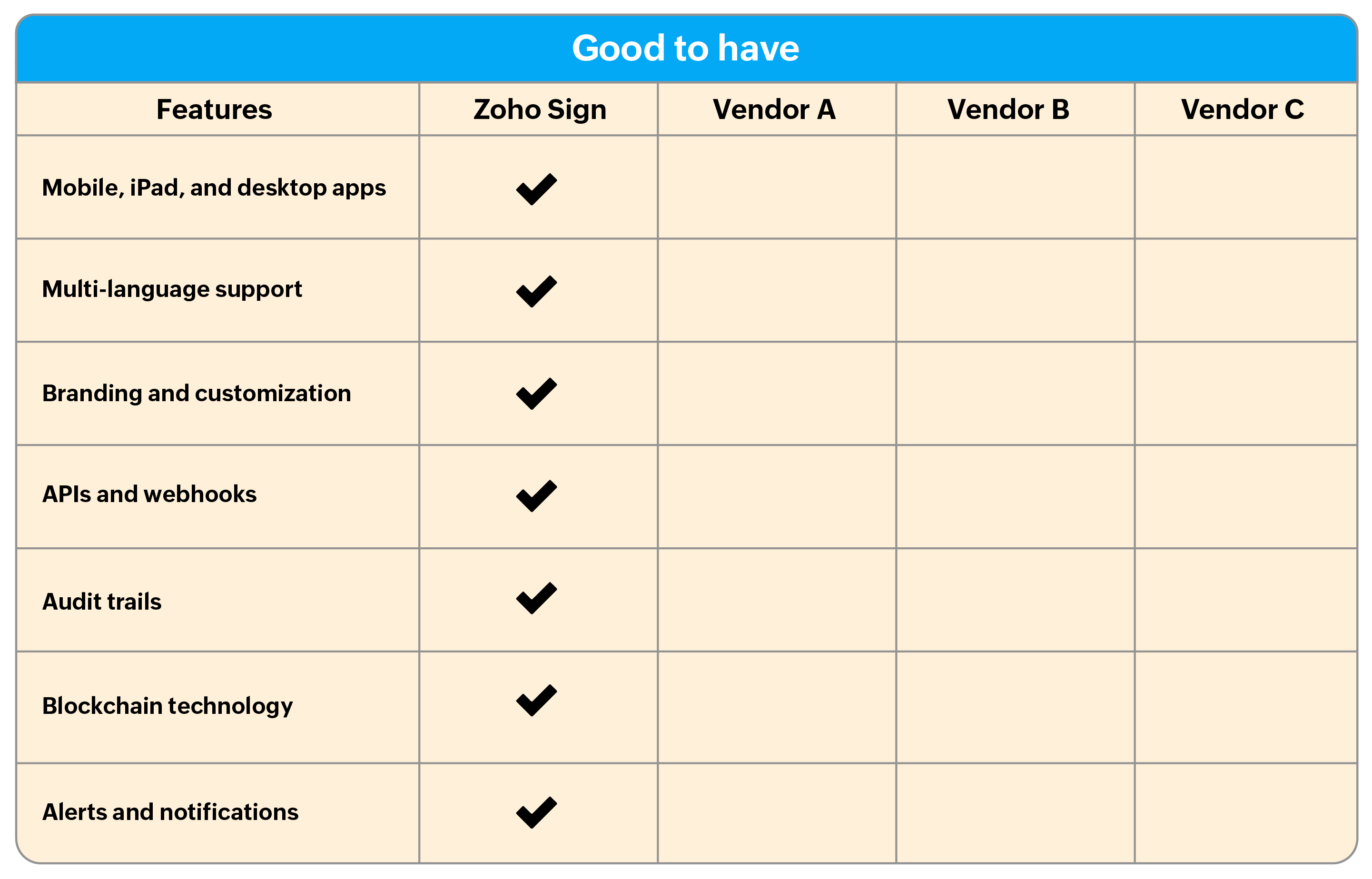 We have also created a checklist with must-have and good-to-have features to look out for while researching and choosing an e-signature application. If you are already using one of the solutions listed below, the following table can help you compare your current option to Zoho Sign.